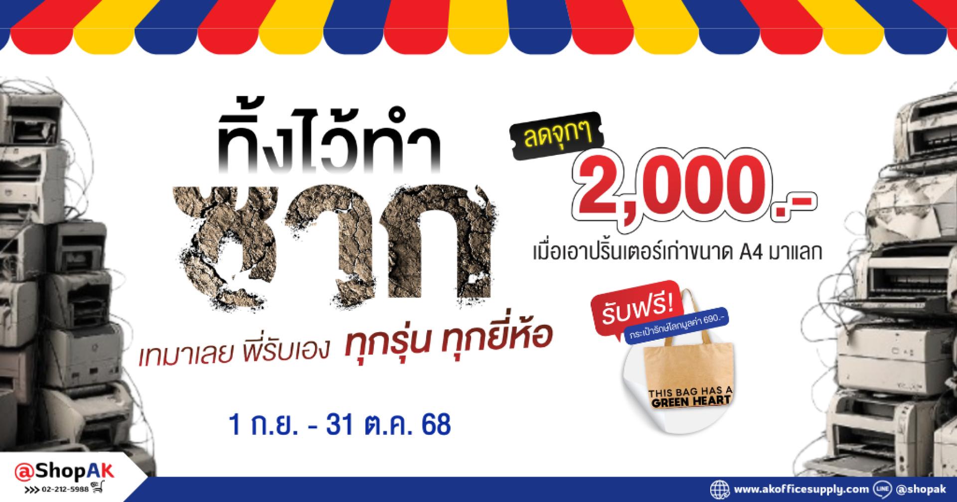 เครื่องที่ลูกค้านำมาแลกรับส่วนลดต้องเป็น เครื่องพิมพ์ขนาด A4 ขึ้นไปชนิดใดก็ได้ เช่น เครื่องพิมพ์เลเซอร์ เครื่องพิมพ์อิงค์เจ็ท เครื่องพิมพ์อิงค์แท็งก์ เครื่องพิมพ์ดอตแมทริกซ์ หรือ เครื่องมัลติฟังก์ชั่น สี/ขาวดำ ยี่ห้อใดก็ได้ สามารถนำมาแลกรับส่วนลดได้ภายในวันที่ 1 กันยายน 31 ตุลาคม 2568 เท่านั้น *