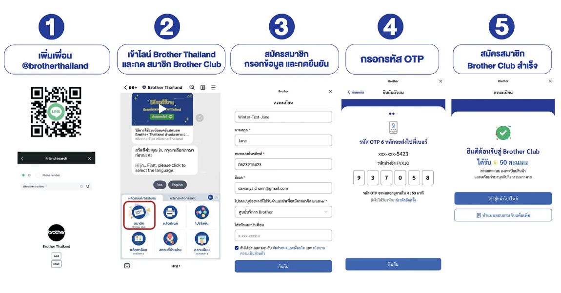 2. ผู้ร่วมกิจกรรมจะต้องเพิ่มเพื่อนผ่านไลน์ @brotherthailand (โดยไม่มีค่าใช้จ่ายแต่อย่างใด) พร้อมลงทะเบียนสินค้าในระบบสมาชิก Brother Club โดย อัพโหลดใบกำกับภาษีเต็มรูปแบบ (Tax Invoice) และกรอกเลขที่ใบกำกับภาษี (Tax Invoice) , วันที่ซื้อ (ลงทะเบียนภายใน 30 วันหลังจากซื้อเท่านั้น), ระบุช่องทางในการซื้อสินค้าของ Brother, รูปแบบสินค้า, รุ่น, หมายเลขเครื่อง, ราคาสุทธิ, และอัพโหลดภาพหมายเลขเครื่อง (Serial No) เพื่อมีสิทธิ์ลุ้นรับรางวัล โดย 1 หมายเลขเครื่องที่ลงทะเบียนสำเร็จในรุ่นที่กำหนด เท่ากับ 1 สิทธิ์ โดยไม่จำกัดจำนวนสิทธิ์