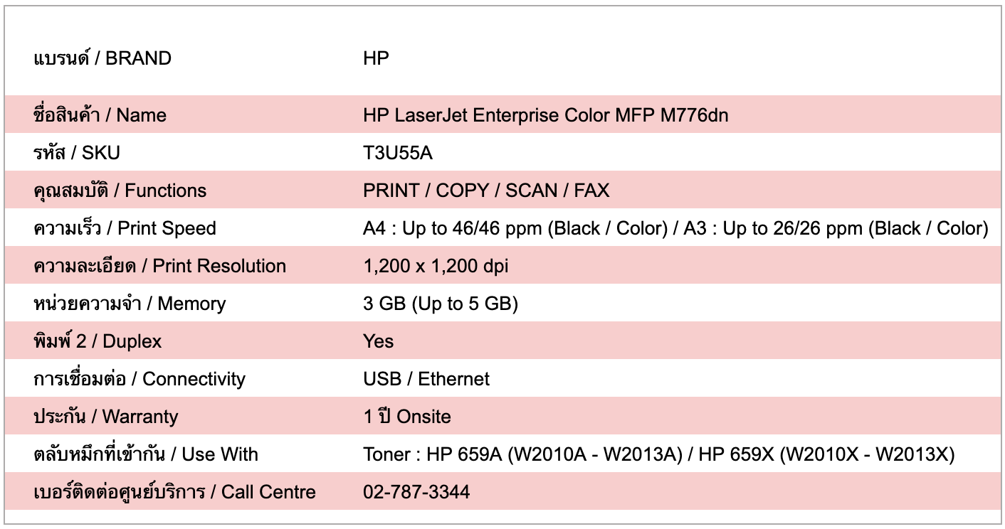รับประกัน 1 ปี พร้อมบริการซ่อมนอกสถานที่จาก HP — HP LaserJet Enterprise Color MFP M776dn เป็นเครื่องพิมพ์เลเซอร์สีมัลติฟังก์ชันระดับองค์กร รองรับการ พิมพ์ สำเนา สแกน และแฟกซ์ ให้คุณภาพสีคมชัด รองรับงานเอกสารปริมาณมากและงานขนาดใหญ่ เหมาะสำหรับสำนักงานขนาดกลางถึงขนาดใหญ่ มาพร้อมการเชื่อมต่อเครือข่ายและระบบจัดการงานพิมพ์ที่มีประสิทธิภาพ