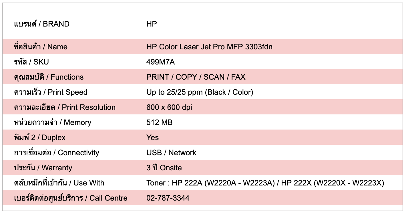 รับประกัน 3 ปี พร้อมบริการซ่อมนอกสถานที่จาก HP — HP Color LaserJet Pro MFP 3303fdn เป็นเครื่องพิมพ์เลเซอร์สีมัลติฟังก์ชัน รองรับ พิมพ์ / สำเนา / สแกน / แฟกซ์ ให้คุณภาพสีคมชัด ความเร็วในการทำงานสูง เหมาะสำหรับสำนักงานขนาดกลาง รองรับการเชื่อมต่อเครือข่ายผ่านสาย LAN และการพิมพ์สองหน้าอัตโนมัติ ช่วยเพิ่มประสิทธิภาพและความต่อเนื่องในการทำงานสำนักงาน